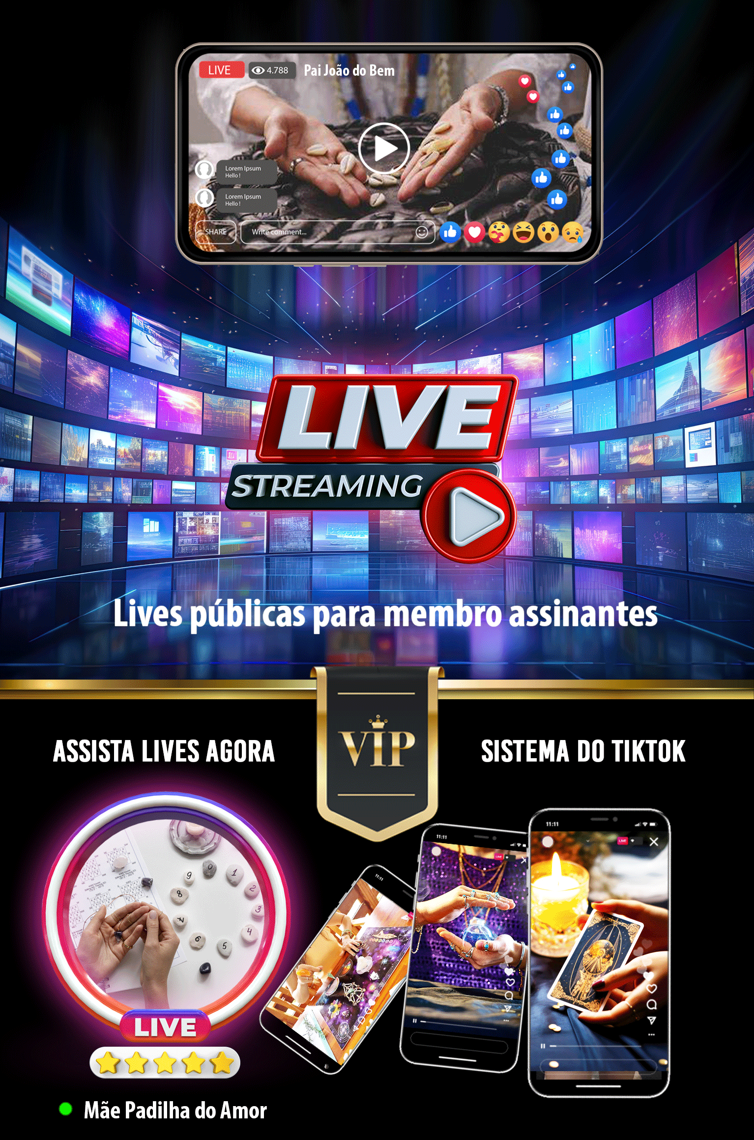 Lives publicas ou privadas, gratuitas ou com valor para entrar, com sistema de monetização similar a do TikTok com presentes e mimos. Monetize suas lives como nunca antes.